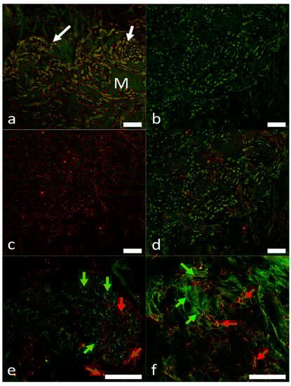 Multiple clusters of pacemaker cells detected by the double immunolabeling with antibodies against Islet-1 (green signal), and HCN1 and HCN2 (red signal) in the SAR. (a) Pacemaker cells (arrows) embedded in the myocardium (M) expressing Islet-1 (green signal) and HCN1 (red signal). (b–f) Pacemaker cells revealed colocalization of Islet-1 and HCN2 (d; merge). Two populations expressing Islet-1 (green signal and arrows) and HCN2 (red signal and arrows), respectively, were observed in e and f. Scale bars: 20 µm.