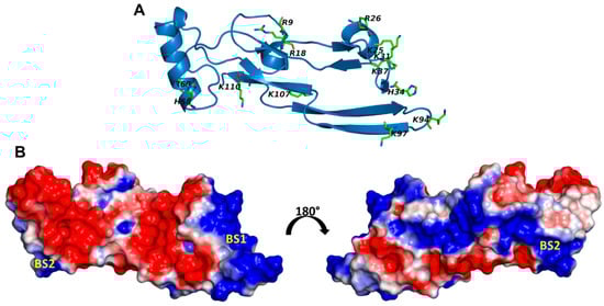 Electrostatic surface potential of TGF-β2: (A) the structure of transforming growth factor (TGF-β2) extracted from PDB (1TGF) showing the basic residues; (B) two potential GAG-binding sites (BS1 and BS2) identified based on electrostatic surface potential.