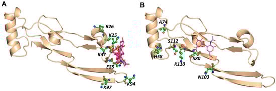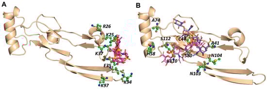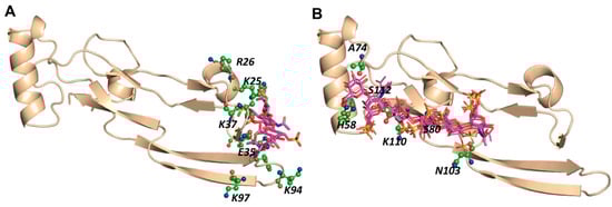The potential sites of CS binding were identified by searching for the presence of the Cardin and Weintraub sequence motif (Figure S1) [] and electropositive domains through surface electrostatic potential calculation using the APBS tool in PyMol. Upon analyzing both the sequence and structure of TGF-β2, the presence of a Cardin and Weintraub pattern was not identified. Based on the electrostatic potential map, two potential binding regions (Figure 2) were identified: binding site 1 (BS1)m with Lys25, Arg26, Lys31, His34, Lys37, Lys94, and Lys97, and binding site 2 (BS2), with His58, Arg60, and Lys110.