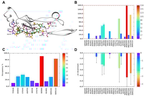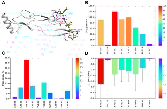 MD simulation of the TGF-β2–CS06 interaction at binding site I (BS1). (A) A representative structure from the MD trajectory showing the hydrogen bonds (H-bonds) between TGF-β2 residues (hot pink; ball and stick representation) and CS06 (green sticks). The protein ribbon is shown in light grey. (B) Inter-molecular H-bond formation in terms of % occupancy (proportion of MD frames showing direct H-bonds) for residues of BS1. (C) Proportion of water-mediated H-bonds (i.e., occupancy) between TGF-β2 for residues in BS1 and CS06. (D) Single-residue energy decomposition (SRED) values for the TGF-β2–CS06 complex for residues of BS1. Error bars show standard deviation. For ease of interpretation, values from lower to higher are represented by rainbow color (blue→red).