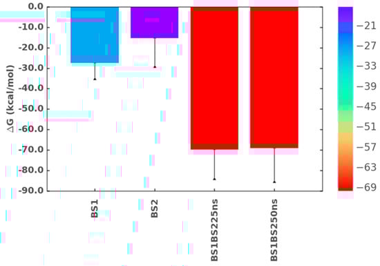 To assess whether the above-mentioned characteristics translate into higher stability, we performed free energy calculations on each MD frame (see Materials and Methods sections) of the protein–ligand co-complexes when CS06 was individually bound in either BS1 or BS2, as well as simultaneously in both sites. Figure 8 shows the total in silico free energy obtained from the MM-GBSA of the three co-complexes. While the TGF-β2–CS06 complex for the occupation of the BS1 site displayed a predicted energy of −27.4 ± 7.3 kcal/mol, that for the BS2 site was calculated to be −15.4 ± 13.4 kcal/mol. This implied that the two sites not only differentially recognize the two CS06 sequences but also differentially stabilize the chains. More specifically, the interactions of the BS2 residues were found to be weaker than those of the BS1 residues. This correlated well with experiments performed on the interaction of natural CS biopolymers with TGF-β2, which showed two binding sites with measurable differences in the solution affinities [].