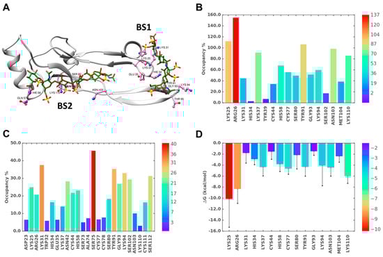 In terms of SRED, Arg26 of BS1 was found to be a dominant contributor to binding energy in the dually occupied TGF-β2–CS06 complex. This residue, located in the H2 helix, was not found to play much of a role in the singly occupied system (Figure 6D). However, a large number of residues distributed over the entire BS1 and BS2 sites contributed to the stability of the dually occupied TGF-β2, which appeared to be the primary reason for the significant stabilization of the dually occupied TGF-β2–CS06 complex (Figure 9).