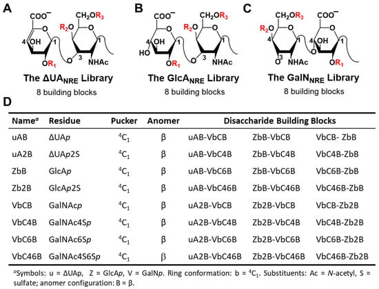 The chondroitin sulfate (CS) disaccharide building blocks and their naming conventions: (A) the ΔUANRE library of oligosaccharides (di- to hexasaccharide) has an unsaturated uronic acid residue at the non-reducing end (NRE) and a GalNp residue at the reducing end; (B) the GlcANRE library has a GlcAp residue at the NRE, and (C) the GalNNRE library has a GalNp residue at the NRE; (D) the list of monomer residues and the R1, R2, and R3 variations for ΔUAp, GlcAp, and GalNp considered in this study. These variations lead to 24 disaccharide building blocks.