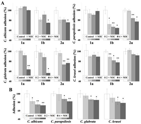 Cells from adherent Candida spp. exhibit increased resistance towards antimycotics and the host immune system than planktonic cells. Thus, for the evaluation of ILs on fungal adhesion, higher concentrations were used, corresponding to 1, 2 and 4 times the MIC90 values (Figure 1).