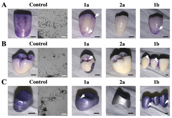 C. albicans biofilm formation visualized by crystal violet (CV) dye on. (A) acrylic dental crowns. (B) PFM dental crowns and (C) dental alloy substructures. Scale bar = 2 mm. Biofilm mass formed on control probes was observed under microscope (40×), scale bar = 50 µm. Samples were treated with ILs (1a,2a,1b) for 2 h to formed C. albicans biofilm. Arrows indicate partial biofilm formed on materials treated with ILs (1a) and (1b).
