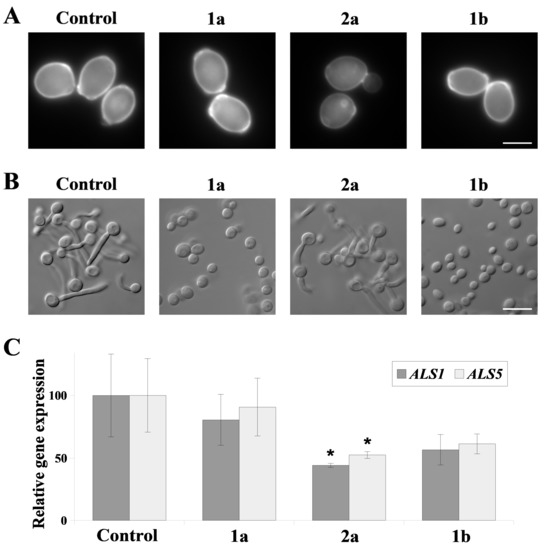 (A) C. albicans calcofluor white staining following a 2 h treatment with 1a,2a,1b ILs (conc. = 25 µM). Control experiment represents untreated calcofluor white-stained cells. Scale bar = 2.5 µm. (B) FBS-induced hyphae formation after 2 h treatment with 1a,2a,1b ILs (conc. = 25 µM). Control condition was C. albicans treated with FBS only. Scale bar = 10 µm. (C) Relative ALS1 and ALS5 gene expression in C. albicans following a 2 h treatment with 1a,2a,1b ILs (conc. = 25 µM). Gene expression levels are reported as means of 2−∆∆CT values (n = 6) ± SD; normalized to 100% for untreated cells (control). Statistical analyses were performed by comparing expression under treatment with each IL to untreated cells. * p < 0.05.