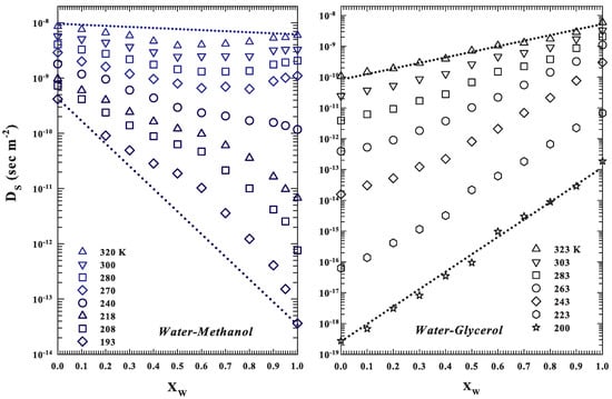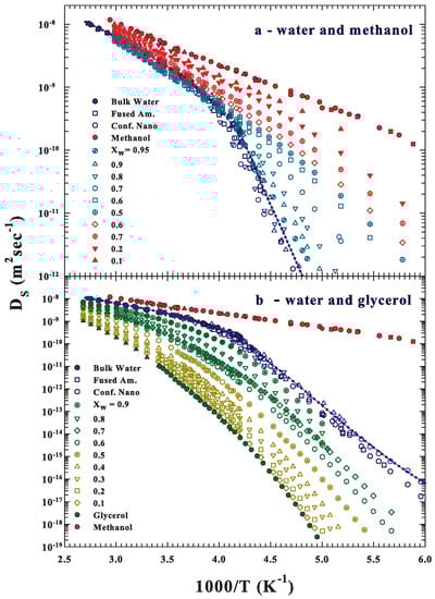 Figure 1 illustrates, in an Arrhenius plot (temperature range K), the self-diffusion data, , of pure water, glycerol, and methanol and their water solutions (many come from NMR and the other from the dielectric experiments and measured as relaxation times ()). Many data have been measured just for this work (specifically for the water–methanol solutions (Figure 1a) at for K; in the water–glycerol case (Figure 1b), the measured concentrations are for K). All other data come from the literature: for the methanol solutions, References [,,,,,,,,] and, for those of glycerol, References [,,,,,]. For water, the reported data come from different experimental approaches: the bulk water data (reported as fully blue symbols) come from NMR experiments [,]; fused amorphous water (dark blue squares []) and MCM confined (actually measured NMR data are illustrated as dark blue squares and as open blue triangles []; and finally, the dielectric relaxation data [] are illustrated as blue open circles).