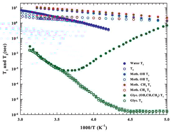 The Arrhenius representation of the measured spin–spin and spin–lattice relaxation times for water, methanol, and glycerol. For methanol and glycerol, the behavior of all of their different hydrophilic (OH) and hydrophobic groups (methine CH, methylenes CH, and methyl CH) are reported.