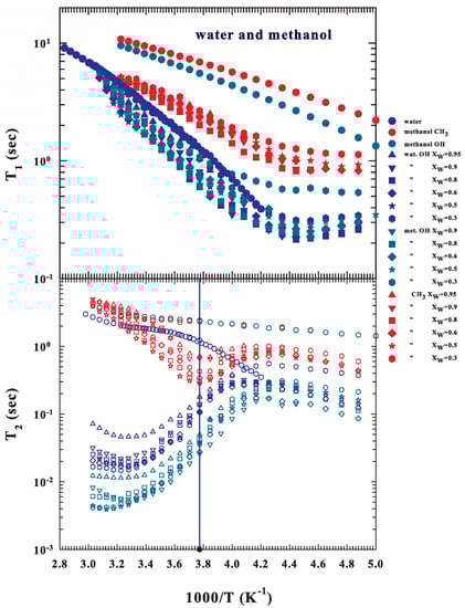 The Arrhenius representation of the NMR relaxation times (top-filled symbols) and (bottom-empty symbols) for water, methanol, and their solutions at the following water molar fractions: and (the same symbol corresponds to each molar fraction). Here, we report the measured values of the hydrophilic (OH) groups of water (blue symbols) and methanol (cyan), and the methanol hydrophobic group (CH, red), showing different behaviors. The vertical blue line on the bottom side indicates 265 K.