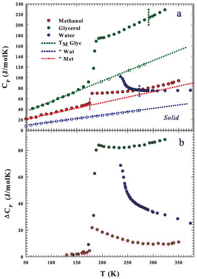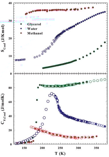 It can be therefore observed that, for glycerol and water, many values belong to the metastable state of supercooled liquid. The figure also shows that the specific heats of water and methanol cross at about 265 K. While below this temperature, those of water are greater than those of methanol, for higher values, it is methanol that has higher and increasing values. As theoretically proposed for water, we can assume [] that the difference between the liquid and solid specific heat can give a good estimation of the configurational contribution, with such a difference for the three substances, , evidenced in the Figure 5b. From the figure, we can observe that water and methanol cross (due to the anomalous behavior of water) at about 265 K. In this frame, we must mention the considered methanol solid contribution that deals with the crystal I form of the two different crystalline states observed by Carlson and Westrum [] and related to the classification of methanol as a plastic crystal on the basis of its small entropy of melting due to the HB effects.