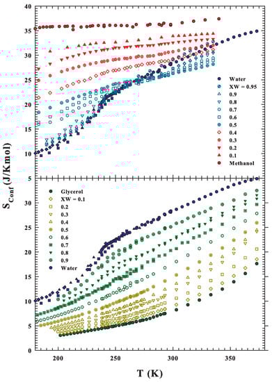 The solutions’ configurational entropies evaluated according with the Adam–Gibbs are proposed as a function of the temperature. At the top are the water-methanol data, and that of water–glycerol are at the bottom. As observed in the methanol solutions, their behavior at higher T ( K) is not continuous with : the pure water is higher than that of solutions for the range 0.9–0.4. As explained, it is due to the hydrophobic effect as proposed by the NMR findings.