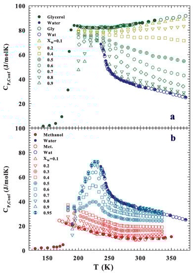 The configurational specific (a) evaluated according to the Adam–Gibbs model for the solutions with water and glycerol at their different water molar fractions is illustrated. The bottom side (b), instead, shows the total specific heat of the water–methanol system, including their solution data and the same quantities evaluated for the water–methanol system. Both and from pure glycerol, methanol, and water are also proposed.