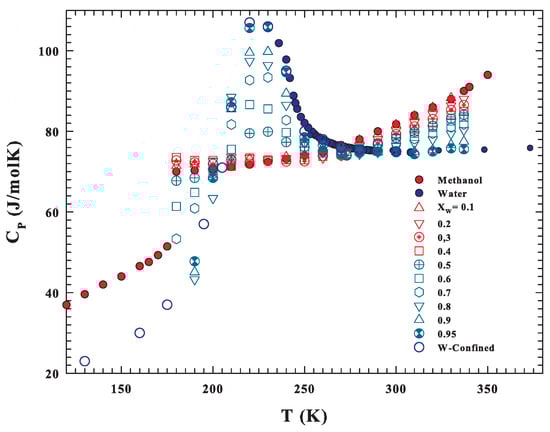 This latter situation becomes clearer if we look at the total specific heat of the water–methanol system reported in Figure 9; the corresponding are obtained by adding the weighted values of the two solid phases to . What these data show finally clarifies that, in this high-temperature region, the behavior of the solutions is dominated by methanol. In fact, from the overall behavior of the reported data, a crossover temperature is evident (∼265 K), above which the methanol specific heat and those of the different solutions are higher than that of pure water, while in the opposite case, the specific heats for water and those of the solutions dominate on the corresponding methanol data.