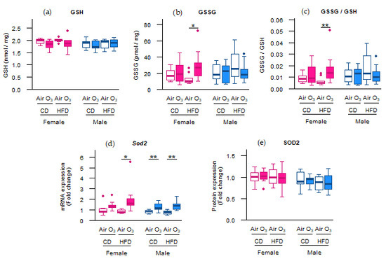 Acute ozone exposure increased pulmonary oxidant status in female offspring from high-fat diet (HFD) dams and all male offspring. (a) Reduced glutathione (GSH), (b) oxidized glutathione (GSSG) and (c) GSSG/GSH ratio, (d) Sod2 mRNA expression, and (e) SOD2 protein expression were assessed within two hours after exposure to filtered air or ozone in the lungs of female and male offspring from dams fed a perinatal control diet (CD) or HFD. Data are presented as boxplots. Statistical analysis by two-way ANOVA with a Holm–Sidak post-hoc test. n = 10 per group (a–c), n = 9–10 per group (d), or n = 7–10 per group (e). * p < 0.05, ** p < 0.01. O3—ozone.