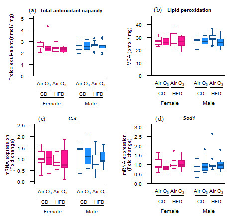 Acute ozone exposure and perinatal high-fat diet (HFD) did not alter the pulmonary (a) total antioxidant capacity, (b) lipid peroxidation, or expression of cytoplasmic antioxidant genes (c) Cat and (d) Sod1. All of the markers were assessed within two hours after exposure to filtered air or ozone in the lungs of female and male offspring from dams fed a perinatal control diet (CD) or HFD. Data are presented as boxplots. Statistical analysis by two-way ANOVA with a Holm–Sidak post-hoc test. n = 10 per group (a,b) or n = 9–10 group (c,d). O3—ozone.