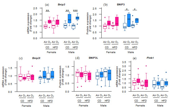 As acute ozone exposure upregulated the mRNA expression of the mitochondrial antioxidant Sod2, but not of the cytoplasmic antioxidants Cat and Sod1, we next examined whether the molecular control of the mitochondrial content in the offspring lungs was affected. Considering that mitochondria are not only a major source of reactive oxygen species (ROS), but can also be damaged by it, we first assessed the gene and protein expression of key regulators of mitophagy. As a result, the mRNA expression of B-cell lymphoma 2/adenovirus E1B 19 kDa protein-interacting protein 3 (Bnip3), a mitophagy receptor [20], was significantly upregulated after ozone exposure in female offspring from CD dams and all male offspring (Figure 3a). Similarly, the BNIP3 protein expression was significantly increased after ozone exposure in the male offspring from CD and HFD dams (Figure 3b). The mRNA and protein expression of B-cell lymphoma 2/adenovirus E1B 19 kDa protein-interacting protein 3-like (Bnip3l), a mitophagy receptor with a close homology to Bnip3 [21], were not affected by ozone exposure or perinatal HFD (Figure 3c,d). Likewise, no differences were observed in the mRNA expression of phosphatase and tensin homolog-induced kinase 1 (Pink1; Figure 3e), a gene essential for ubiquitin-mediated mitophagy [22]. These results suggest that acute ozone exposure induced changes in the abundance of the molecular machinery controlling the receptor-mediated mitophagy in the offspring lungs rather than ubiquitin-mediated mitophagy in the female offspring from CD dams and all male offspring.