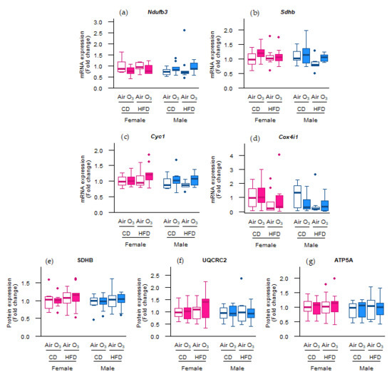 Perinatal high-fat diet (HFD) or acute ozone exposure did not change the pulmonary expression of oxidative phosphorylation machinery subunits. mRNA expression of (a) Ndufb3 (complex I), (b) Sdhb (complex II), (c) Cyc1 (complex III), and (d) Cox4i1 (complex IV), and the protein expression of (e) SDHB (complex II), (f) UQCR2 (complex III), and (g) ATP5A (complex V) were assessed within two hours after exposure to filtered air or ozone in the lungs of female and male offspring from dams fed a perinatal control diet (CD) or HFD. Data are presented as boxplots. Statistical analysis by two-way ANOVA with Holm–Sidak post-hoc test. n = 9–10 per group (a–d) or n = 7–10 per group (e–g). O3—ozone.