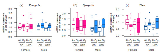 Perinatal high-fat diet (HFD) or acute ozone exposure did not affect the molecular regulation of mitochondrial biogenesis. (a) Ppargc1a, (b) Ppargc1b, and (c) Tfam mRNA levels were measured within two hours after exposure to filtered air or ozone in the lungs of female and male offspring from dams fed a perinatal control diet (CD) or HFD. Data are presented as boxplots. Statistical analysis by two-way ANOVA with a Holm–Sidak post-hoc test. n = 9–10 per group. O3—ozone.