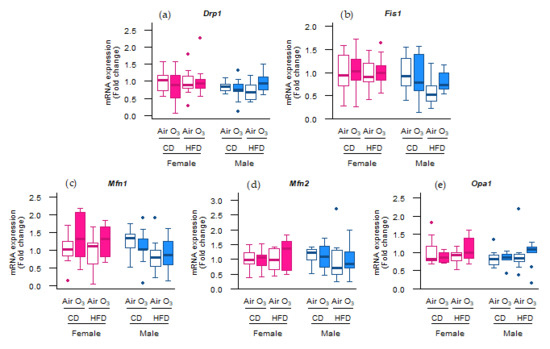 Acute ozone exposure and perinatal high-fat diet (HFD) did not alter the pulmonary molecular regulation of mitochondrial fission or fusion. Expression of fission genes (a) Drp1 and (b) Fis1, and fusion genes (c) Mfn1, (d) Mfn2, and (e) Opa1 was measured within two hours after exposure to filtered air or ozone in the lungs of female and male offspring from dams fed a perinatal control diet (CD) or HFD. Data are presented as boxplots. Statistical analysis by two-way ANOVA with a Holm–Sidak post-hoc test. n = 9–10 per group. O3—ozone.