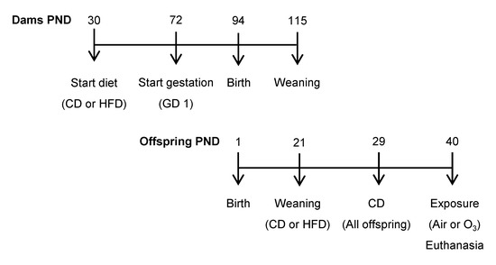 Experimental design. PND—postnatal day; GD—gestational day; CD—control diet; HFD—high-fat diet; O3—ozone.