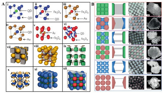 Besides the wide range of superlattice structures assembled by the co-crystallization of homogeneous building blocks, researchers also tried to explore the assembly of different building blocks in order to integrate the functions of multiple materials. For instance, Park investigated the co-crystallization of a binary system including two same AuNPs with different sizes [6]. On the basis of the above pioneering work, other binary NPs systems were reported for the assembly of highly ordered lattices [27,28,29,30]. Sun et al. combined quantum dots (QDs) and gold nanoparticles(AuNPs) into a heterogeneous body-centered cubic lattice superlattice [27]. Zhang et al. synthesized lattices by arbitrary binary combination of QD, AuNPs, and Fe3O4 NPs [29] (Figure 2Ai–vi), in which the particle size, composition, interparticle distance, and crystal symmetry could be controlled independently.