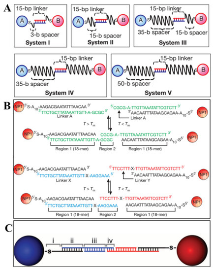 SsDNA linkages between NPs. (A) Connection by two linkers on the surface of NPs (System I to V: different spacers in length) (Adapted with permission from [7]. Copyright 2008, Springer Nature.); (B) connection by a free linker including a flexor region (X region) (Adapted with permission from [6]. Copyright 2008, Springer Nature.); (C) polyvalent conjugates of DNA and AuNPs by four free linkers. (Adapted with permission from [8]. Copyright 2011, American Association for the Advancement of Science.).