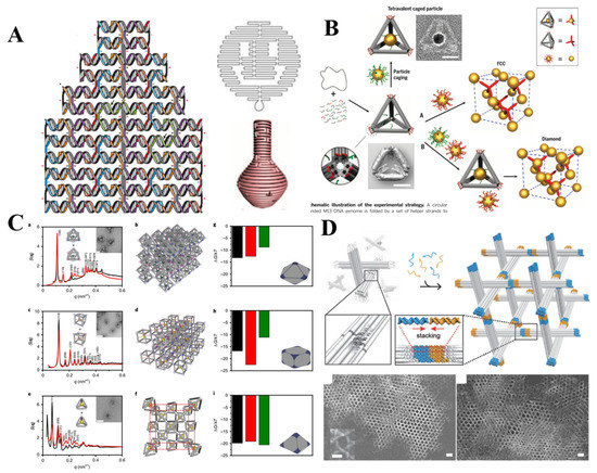 (A) Design of DNA origami and DNA origami-based simple 2D planar structure and intricate 3D architectures. (Adapted with permission from [44]. Copyright 2006, Springer Nature.) (Adapted with permission from [46]. Copyright 2011, American Association for the Advancement of Science); (B) face-centered-cubic and diamond lattice guided by DNA origami tetrahedron. (Adapted with permission from [14]. Copyright 2016, American Association for the Advancement of Science); (C) DNA origami tetrahedron, octahedron, cubic with different valances were employed to engineer diamond type, simple cubic and body-centered-cubic 3D AuNPs lattices. (Adapted with permission from [58]. Copyright 2020, Springer Nature.); (D) DNA origami-based structure assembled into 3D rhombohedral crystal. (Adapted with permission from [59]. Copyright 2018, WILEY-VCH Verlag GmbH & Co. KGaA, Weinheim).