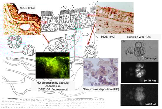Nitric oxide plays both physiological and inflammatory roles, based on the surrounding pro- or anti-inflammatory conditions, as well as the local concentration of NO itself. Free radicals, such as reactive oxygen species (ROS) and reactive nitrogen species (RNS), are cell metabolic products that participate in a variety of cellular events in the airway. These molecules usually have at least one unpaired electron, so they easily react with various substances in the body that are directly exposed to the external atmosphere [44,45]. In the respiratory tract, the function of NO is involved in both the type 1 and type 2 immune responses. In this sense, NO is a key molecule in the Th1/Th2 balance that regulates the evolution of many clinically important diseases. These delicate and complicated effects of NO are dependent on the level and duration of NO production. In general, type 1 inflammation is triggered by low amounts of NO, whereas type 2 cell proliferation is accompanied by the production of IgE and a recruitment of eosinophils that can be induced by higher NO concentrations [23,24,46,47].