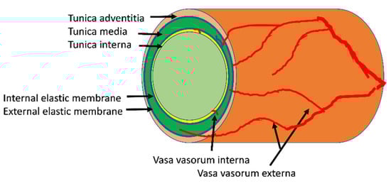 In humans, the vasa vasorum is present in the walls of many larger arterial vessels including the coronary arteries, the aorta and its branches, (subclavian, carotid, iliac, femoral and brachial) and the intercostal arteries branching off the descending thoracic aorta []. Anatomically, there is the first order vasa which runs longitudinally between the adventitia and media paralleling the lumen while second order vasa run circumferentially around the vessel and often penetrates into the tunica media.