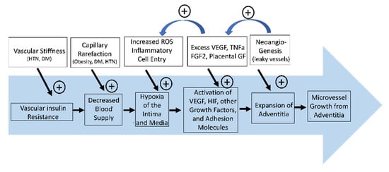 Vascular insulin resistance from metabolic disease such as hypertension and diabetes causes thickening of the intimal layer of the vasa vasorum. This (along with capillary rarefaction) leads to a decrease in blood flow feeding the arterial wall and relative hypoxia of the intimal and medial layers. This activates VEGF, HIF1, HIF2, TNFa, fibroblast growth factor 2, placental growth factor, and adhesion molecules and initiates a positive feedback loop that promotes more hypoxia as these inflammatory molecules increase ROS. This leads to expansion of the adventitia and promotes neoangengiogensis and further vessel injury.