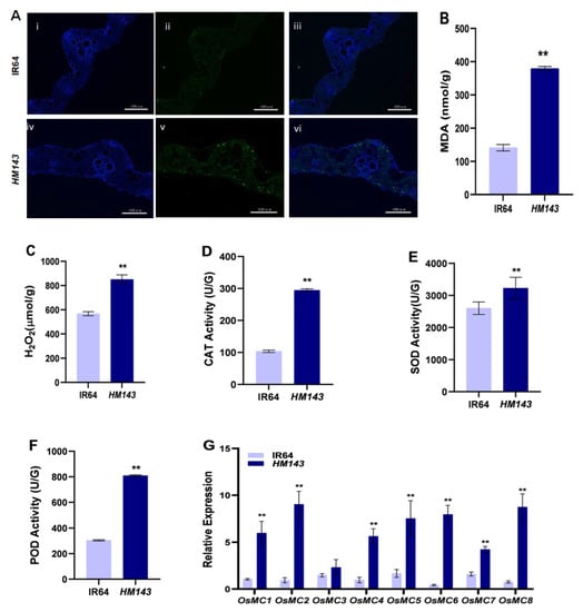 Analysis of cell death and ROS accumulation in IR64 and HM143 at tillering stage. (A) TUNEL assay. Blue signal represents 4′, 6-diamino-phenylindole (DAPI) staining; green color represents positive result. (i) and (iv) are DAPI staining; (ii) and (v) are TUNEL signal; (iii) and (vi) are merged images of (i/iv) andrespectively, Bar = 100 µm; (B) Malonaldehyde (MDA) contents; (C) H2O2 contents; (D–F) CAT, SOD and POD enzyme activities (G) Expression analysis of OsMCs genes. Data are means ± SD of three biological replicates (Student’s t-test: * ** p < 0.01).