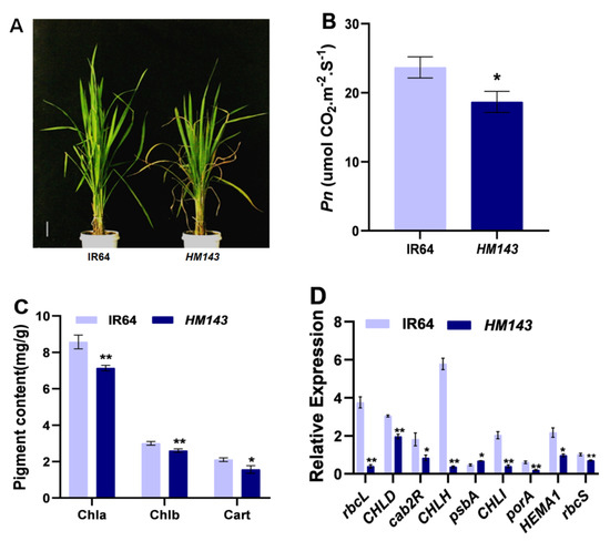 Analysis of leaf senescence in IR64 and HM143 at the tillering stage. (A) Phenotypes of IR64 and HM143 at the tillering stage, bar = 17 cm; (B) Net Photosynthetic rate (Pn); (C) Pigment content of IR46 and HM143; (D) Expression levels of photosynthetic related genes. Data are means ± SD of three biological replicates (Student’s t-test: * p < 0.05; ** p < 0.01).