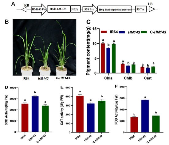 Genetic complementation of the mutant. (A) Complementation construct. (B) Phenotypes of IR64, HM143 and complemented transgenic line (C-HM134). (C) Pigment contents in IR64, HM134 and C-HM143 at heading stage. (D–F) Enzyme activities of SOD, CAT and POD in IR64, HM143 and C-HM143 at heading stage. Data are means±SD of three biological replicates. Different letters indicate significant differences according to One-way ANOVA and Duncan’s test (p ≤ 0.05).