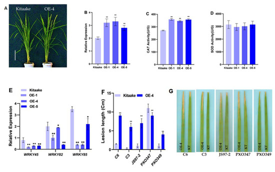 It has been reported that HM143 enhances disease resistance to multiple bacterial blight pathogens []. To access the disease response to bacterial blight pathogens in the OE lines, we performed bacterial inoculation of five different bacterial blight races, namely C3, C6, JS97-2, PXO347, and PXO349, between the Kitaake and OE-4 lines. We found that the OE-4 lines were more susceptible to bacterial blight pathogens compared to Kitaake, except for PXO347 (Figure 5F,G). We examined the expression pattern of three different pathogenesis-related (PR) genes (WRKY45, WRKY82, and WRKY85). The results showed that these PR genes were poorly expressed in the OE-4 plants compare with Kitaake (Figure 5E). These findings demonstrate that the OsHCAR gene is involved in regulating bacterial blight resistance and that overexpression of OsHCAR enhances disease susceptibility in rice.
