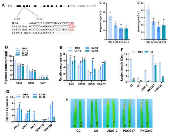 Analysis of OsHCAR knockout lines using CRISPR/Cas9. (A) CRISPR/CAS9 mediated mutation at target sites of OsHCAR in knockout lines. Cr–12, Cr–18 are homozygous mutants carrying 1 bp insertion whereas Cr-19 carries 11 bp deletion, the black letters represent the sgRNA target sequence and the underlined red letters represents PAM motif. (B) Chlorophyll content, (C) Net photosynthetic rate (Pn). (D) Stomatal conductance (Gs). (E) Relative expression of senescence genes. (F) Lesion length (cm). (G) Relative expression analysis of pathogenesis related genes in WT and knockout lines and (H) leaf phenotypes of WT and knockout lines after bacterial blight inoculation. Data are means ± SD of three biological replicates (B–E,G) and five biological replicates (F) (Student’s t-test: * p < 0.05; ** p < 0.01).