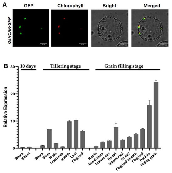 qRT-PCR analysis of wild-type OsHCAR messenger RNA expression and subcellular localization of OsHCAR. (A) Subcellular localization of OsHCAR-GFP in rice protoplasts. Bar = 10 µm (B) Quantitative relative expression levels of OsHCAR in various tissues of IR64 at different growth stages. Rice ubiquitin gene (LOC_Os03g13170) was used as reference gene.