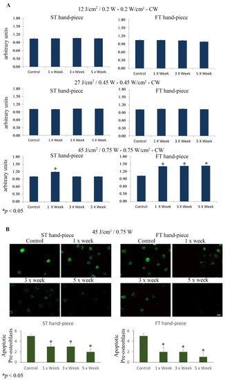 (A). Effect of photobiomodulation on pre-osteoblast metabolic activity. The MTS assay (n = 6) was performed after the MC3T3-E1 cell line was irradiated by 12 J/cm2/0.20 W, 27 J/cm2/0.45 W, or 45 J/cm2/0.75 W using the standard (ST) or flat-top (FT) hand-piece. The frequency of irradiation was once per week (1× Week), three times (alternate day, 3× Week), and five times (every day, 5× Week). Note the increased cell viability after the 45 J/cm2/0.75 W treatment with the ST hand-piece at 1× per week and with the FT hand-piece at all time point protocols (values represent means ± S.E., p < 0.05 compared to the control). (B). Representative photomicrographs of Fluorescein-FragEL-positive osteoblasts that decreased after ST hand-piece and FT hand-piece laser treatment at 45 J/cm2/0.75 W for 1× week until 5× week. The quantitative analysis was performed as previously described in Materials and Methods Section; * p < 0.05. Bar, 10 µm.