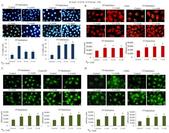 Effect of 45 J/cm2–0.75 W laser treatment on pre-osteoblast proliferation. The frequency of irradiation was once per week (1× Week), three times (alternate day, 3× Week), and five times (every day, 5× Week). (A). The Hoechst stain assay revealed increased cell viability using both standard (ST) and flat-top (FT) hand-pieces. Notably, the FT device has managed to yet again increase the efficacy of the laser treatment at all time points applied (values represent means ± S.E., p < 0.05 compared to the control). (B–D). Single immunolabeling for c-myc (B) cyclin D3 (C) and CDK4 (D). The Fluorescence analysis was quantified by a Tecan Infinite fluorescence reader and values were analyzed by Magellan v4.0 software. Asterisks show the statistically significant differences of the samples analyzed compared with the control counterpart. Values represent means ± S.E.; * p < 0.05 (n = 4). Bar, 10 µm.