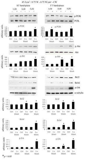 Effect of 45 J/cm2–0.75 W laser treatment on anti-apoptotic/pro-survival markers. The frequency of irradiation was once per week (1× Week), three times (alternate day, 3× Week), and five times (every day, 5× Week). Western blotting analysis of p.PI3K, p.Akt, Bcl2, Bclxl, and p.Erk was performed (n = 3). Note the increase in pro-survival proteins, which was particularly evident using the FT device (values represent means ± S.E., * p < 0.05 compared to the control).