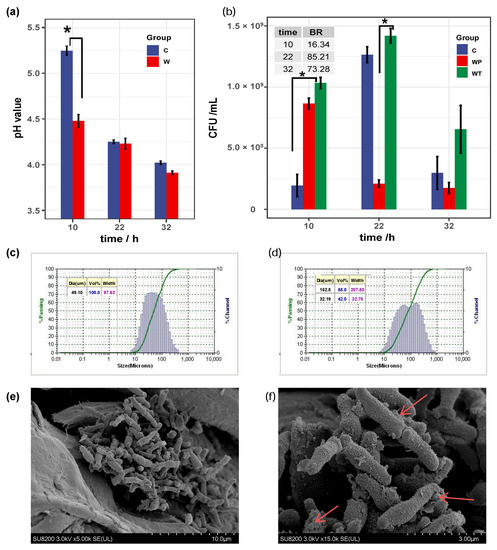 In this study, we used WF as a carrier in the fermentation system and evaluated the biofilm formation by the biofilm formation rate, carrier particle size and FESEM. The pH values in the control and WF cultures of B. bifidum were decreased during fermentation and lower than 4.0 at 32 h (Figure 1a). The pH value in WF culture was significantly lower than that in control culture at 10 h (p < 0.05). There were 1.95 × 108 and 1.03 × 109 CFU/mL in the control culture and the WF culture at 10 h (Figure 1b), respectively (p < 0.05). These results suggest that cells attached to carriers in the early fermentation stage and proliferated rapidly, producing more acidic substances than control culture. Figure 1c shows WF with an average particle size of around 50 µm. However, the average particle size was over 150 µm (Figure 1d) with the biofilm rate higher than 85% (Figure 1b) at 22 h. The FESEM results showed that B. bifidum cells adhered to the surface of WF (Figure 1e) and secreted extracellular substances to form the biofilm (Figure 1f). The biofilm rate, carrier particle size and FESEM results indicate that the formation of B. bifidum biofilm includes the adsorption of cells to the carrier at the initial stage (0–10 h), the growth and development of the biofilm (22–32 h) and the dispersion of the biofilm.