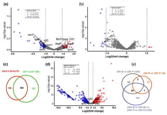 Transcript profiling changes during B. bifidum FHB150 biofilm formation. (a) The volcano plot showing the DEGs between 22 h B and 22 h P. DEGs: differentially expressed genes. Red points represent upregulated DEGs and blue points represent downregulated DEGs. B: biofilm cells, the group containing wheat fiber. P: planktonic cells, the control group without wheat fiber. (b) The volcano plot showing the DEGs between 32 h B and 32 h P. (c) Venn diagram representing the number of DEGs between 32 h B vs. 22 h B and 32 h P vs. 22 h P. (d) The volcano plot showing the DEGs changes during biofilm formation (22–32 h). (e) Venn diagram representing the number of nonredundant DEGs during biofilm formation.