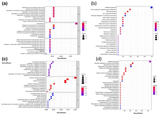 To investigate the function of these nonredundant DEGs during B. bifidum biofilm formation, we performed a functional analysis using Gene Ontology (GO) and Kyoto Encyclopedia of Genes and Genomes (KEGG) pathway terms (Figure 3). Thirteen genes (budA, cscA, folC, groL, groS, infC, mgtA, mrp, nrdG, rarD, tam, ulaE) were categorized into “biological process” (BP), “cellular component” (CC) and “molecular function” (CF) GO terms, including “response to abiotic stimulus”, “regulation of gene expression”, “extracellular region”, “transporter activity” and “peptide biosynthetic process”, and the top 10 terms are shown in Figure 3a. Meanwhile, Figure 3b shows the KEGG pathways of DEGs, including “two-component system” (Bbi37|peg.1341, degP, pstS, vanY), “amino sugar and nucleotide sugar metabolism” (Bbi37|peg.282, Bbi37|peg.249, Bbi37|peg.376, Bbi37|peg.680, Bbi37|peg.1418, Bbi37|peg.1494), “peptidoglycan biosynthesis” (pbpB, pon1, vanY), “quorum sensing” (Bbi37|peg.1221) and “biosynthesis of amino acids” (metC). There was only one functional DEG (tam) identified in 32 h that was labeled “interspecies interaction between organisms”. Interestingly, the DEGs from 22 to 32 h were associated with functional terms, including “response to stress” (infC, groL), “oxidation–reduction process” (asd, bcp, nrdG), “cysteine and methionine metabolism” (asd, cysB, ilvE, metC), “lysine biosynthesis” (asd, dapD), “alanine, aspartate and glutamate metabolism” (iaaA), “lipid metabolic process” (pldB, dus) and “bacterial secretion system, quorum sensing” (yajC) (Figure 3c,d). The function of DEGs indicates that biofilm formation of B. bifidum was related to abiotic stimulation, stress response, protein and polysaccharide biosynthesis, two-component system, quorum sensing and global regulatory factors.