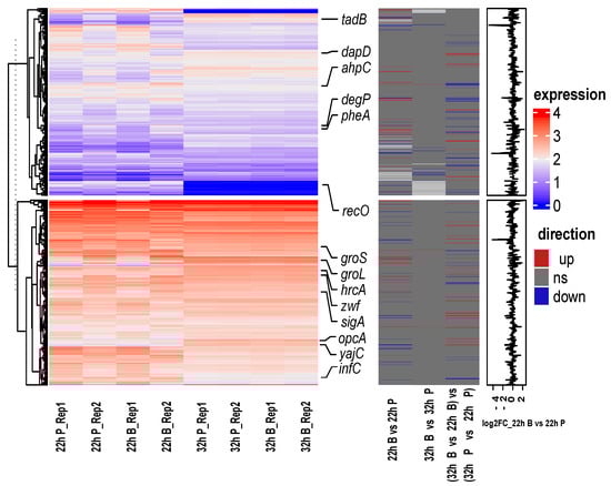 Gene expression heatmap of B. bifidum FHB150. The left heat map shows the gene expression levels in different samples. Red indicates a higher gene expression level, and blue indicates a lower gene expression level. The color from red to blue indicates log10 (FPKM +1) from high to low. The middle heat map shows the three directions of genes, upregulated, downregulated or ns (no significance). FPKM: fragments per kilobase of exon per million mapped fragments. The right bar graph is the differential expression log2 FC of genes in 22 h B vs. 22 h P. FC: fold change.