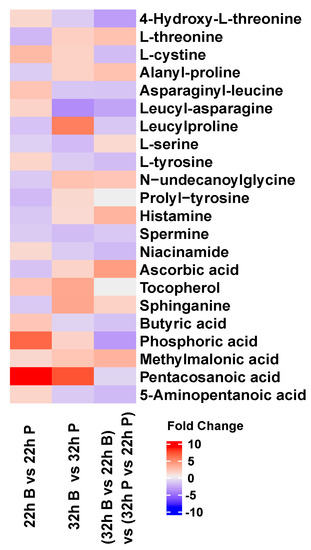 To further study the key metabolites during biofilm formation, we used MetaboAnalyst 5.0 to search the function of 219 nonredundant differentially expressed metabolites. Notably, 22 metabolites were mainly amino acids, short-chain fatty acids and vitamins (Figure 7). L-Cystine (KEGG C00491), asparaginyl-leucine (HMP HMDB0028735), tocopherol (KEGG C02483), butyric acid (KEGG C00246), phosphoric acid (KEGG C00009) and pentacosanoic acid (HMP HMDB0002361) were respectively upregulated 2.67-, 2.11-, 2.10-, 2.03-, 6.37-, and 8.70-fold in 22 h B vs. 22 h P. Leucylproline (HMP HMDB0011175), N-undecanoylglycine (HMP HMDB0013286), tocopherol, sphinganine (KEGG C00836), methylmalonic acid (KEGG C02170) and pentacosanoic acid were respectively upregulated 5.39-, 2.34-, 3.52-, 3.55-, 2.08- and 7.10-fold in 32 h B vs. 32 h P. Leucyl-asparagine (HMP HMDB0028924), L-serine (KEGG C00065) and spermine (KEGG C00750) were respectively downregulated 3.95-, 2.08- and 2.14-fold in 32 h B vs. 32 h P. L-Threonine, alanyl-proline (HMP HMDB0028695), N-undecanoylglycine, histamine (KEGG C00388), ascorbic acid (KEGG C01041) and methylmalonic acid were upregulated, while 4-hydroxy-L-threonine, L-cystine, leucyl-asparagine, L-tyrosine (KEGG C00082), niacinamide (KEGG C00153), phosphoric acid and 5-aminopentanoic acid (KEGG C00431) were downregulated during biofilm growth (32 h B vs. 22 h B) vs. (32 h P vs. 22 h P). This finding indicates that amino acids, short-chain fatty acids and vitamins were key metabolites and their expression levels were different during biofilm formation.