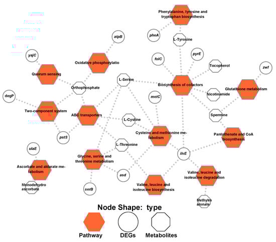 To provide a more comprehensive understanding of biofilm formation, the transcript–metabolite interaction network was generated for DEGs and the differentially expressed metabolites. The gene–metabolite interaction consists of 36 nodes connected via 41 edges (Figure 8). Thirteen pathways were identified during the integration of both transcriptomics and metabolomics data, including ABC transporters; ascorbate and aldarate metabolism; biosynthesis of cofactors; cysteine and methionine metabolism; glutathione metabolism; glycine, serine and threonine metabolism; oxidative phosphorylation; pantothenate and CoA biosynthesis; phenylalanine, tyrosine and tryptophan biosynthesis; quorum sensing; two-component system; valine, leucine and isoleucine biosynthesis; and valine, leucine and isoleucine degradation. The DEGs that relate to the integration pathways included asd, atpB, degP, folC, ilvE, metC, pheA, pstS, pyrE, serB, ulaE, yajC and zwf. The differentially accumulated metabolites included L-cystine, L-serine, L-threonine, L-tyrosine, methylmalonate, monodehydroascorbate, nicotinamide, orthophosphate, spermine and tocopherol. Overall, the integration analysis successfully identified pathways that may be associated with biofilm formation.