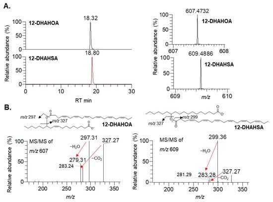Structural characterization of DHA-derived FAHFAs. (A) Extracted ion chromatograms of 12-DHAHOA, 12-DHAHSA (left panel), and their respective high-resolution mass spectra (right panel). (B) MS/MS spectra of 12-DHAHOA and 12-DHAHSA.