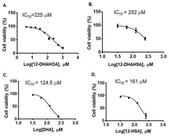 Cytotoxicity of DHA-derived FAHFAs and their free fatty acids. (A) 12-DHAHOA, (B) 12-DHAHSA, (C) DHA and (D) 12-HSA (mean ± SD (n = 6)).