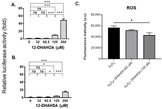 Evaluation of the antioxidant potential of DHA-derived FAHFAs in C3A cells. Reporter gene assay results of 12-DHAHOA (A) and 12-DHAHSA (B) treatment. (C) The fluorescence intensity responses to oxidative stress induced by H2O2 and the effect of 12-DHAHOA treatment. * p < 0.05, *** p < 0.001, ns: not significant (one-way ANOVA) (n = 6, mean ± SEM).