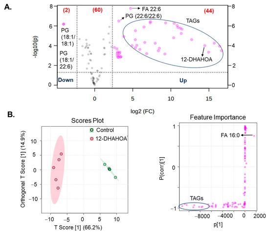 (A) Volcanic plot of all the annotated lipids (only species changed by 5-fold are highlighted with applied t-test of p < 0.05). (B) Orthogonal partial least squares discriminant analysis (OPLS-DA). Score plot and feature importance; colored circles display 95% confidence regions; Control (n = 5) and 12-DHAHOA (n = 5) (Predictive component 1: R2X = 0.662, R2Y = 0.965, Q2 = 0.954; Orthogonal component 1: R2X = 0.149 R2Y = 0.00218, Q2 = 0.0162; All components: R2X(cum): 0.811). Q2 and R2 values represent the predictability and goodness of fit, respectively.
