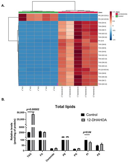 (A) Hierarchical cluster correlation analysis of top 20 significantly altered species (t-test, p < 0.05, distance measure: Euclidean; clustering algorithm: Ward. Each colored cell on the map corresponds to a concentration value of lipids, with samples in rows and compounds in columns. Red: increased, Blue: decreased). (B) Relative levels of total lipids in control (C3A) and 12-DHAHSA treated samples (t-test, p < 0.05) (mean ± SEM (n = 5). (TAG: Triacylglycerol, FA: Fatty acid, PE: Phosphatidylethanolamine, PG: Phosphatidylglycerol, PI: Phosphatidylinositol, and PS: Phosphatidylserine).